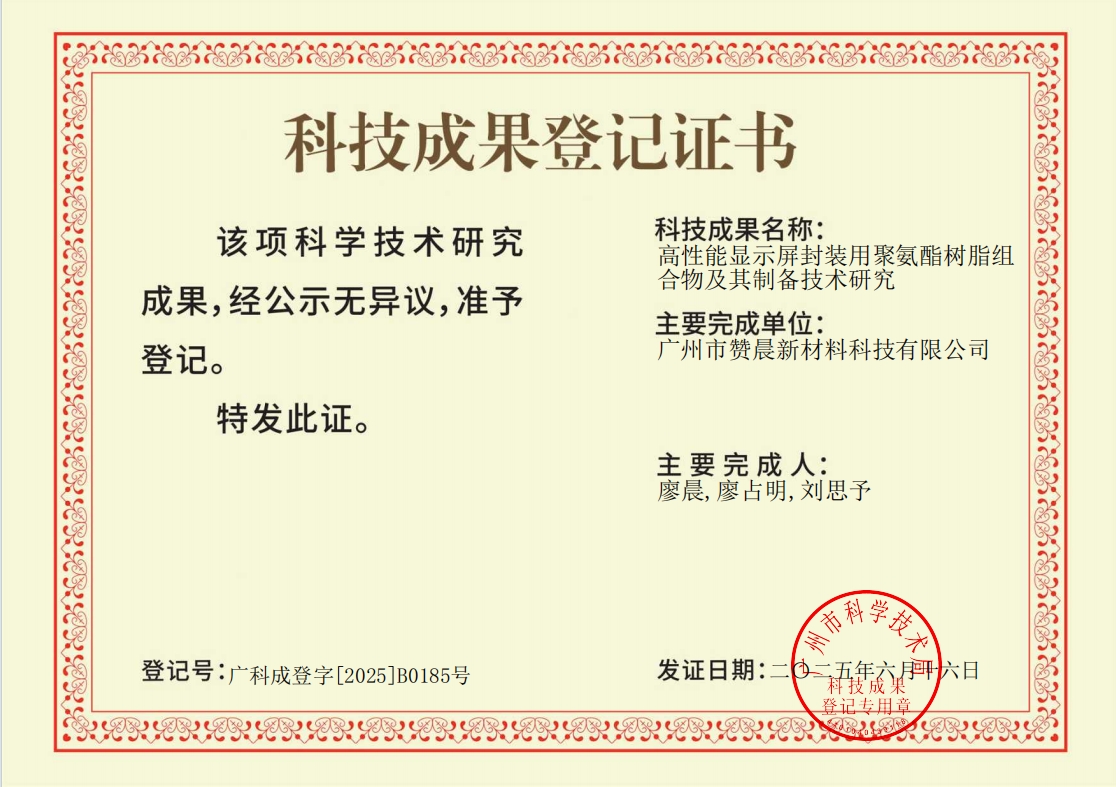 廣州市贊晨新材料科技有限公司高性能顯示屏封裝用聚氨酯樹脂組合物及其制備技術(shù)獲國內(nèi)領(lǐng)先鑒定?